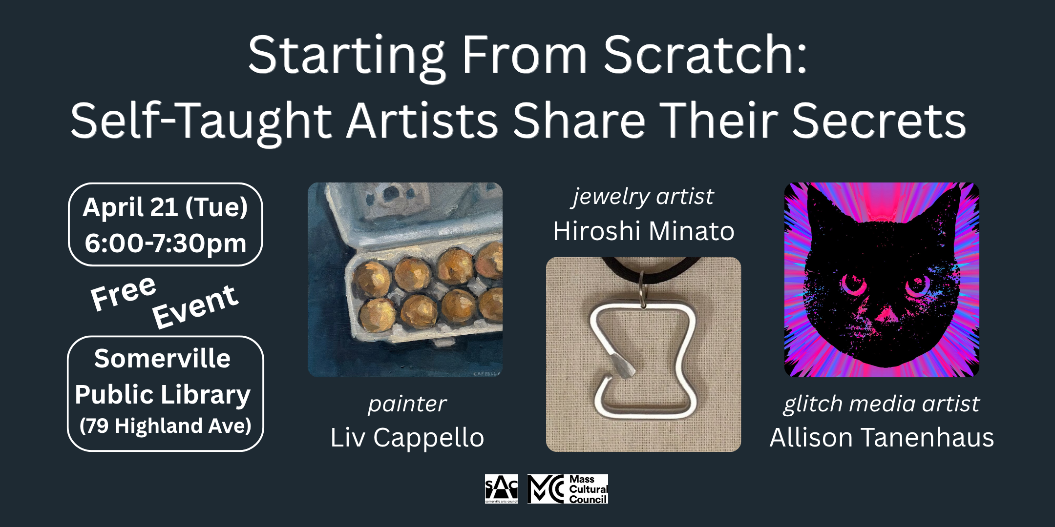 • I’ll be talking about my self-taught experiences at a panel discussion with other local artists. Tuesday, April 21, 6–7:30 pm, at the Somerville Public Library.